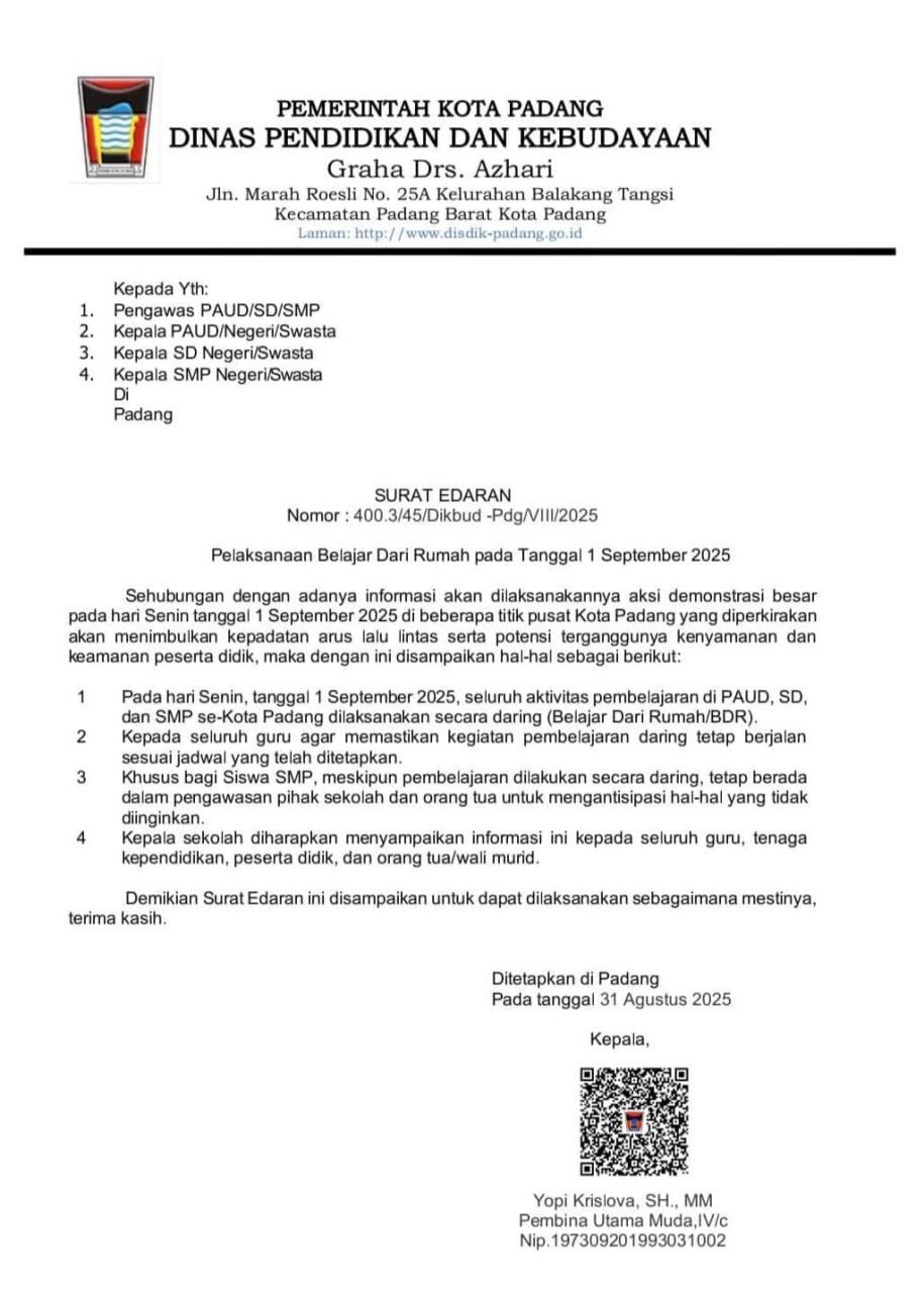 Kebijakan ini tercantum dalam Surat Edaran Nomor: 400.3/45/Dikbud -Pdg/VIII/2025. Yopi menjelaskan bahwa demonstrasi ini diperkirakan akan menyebabkan kepadatan lalu lintas dan berpotensi mengganggu kenyamanan dan keamanan para siswa.