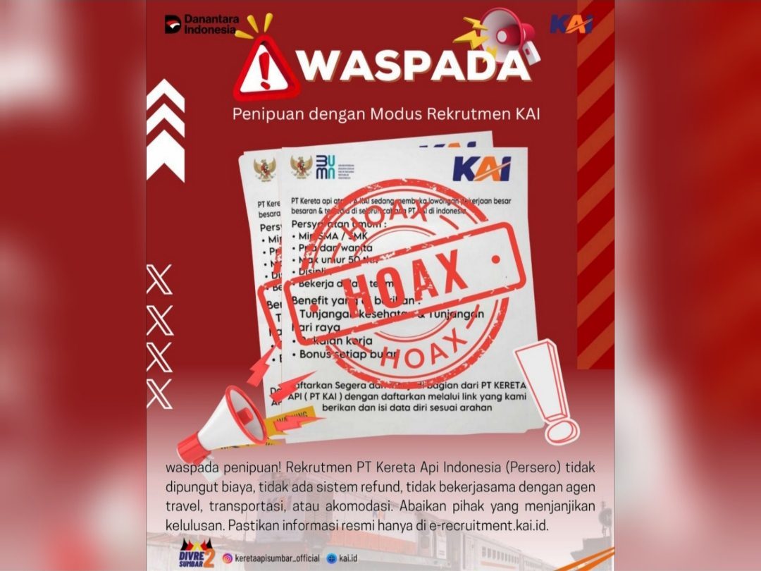KAI Divre II Sumbar kembali mengingatkan masyarakat untuk terus waspada terhadap segala bentuk penipuan dengan modus rekrutmen KAI.