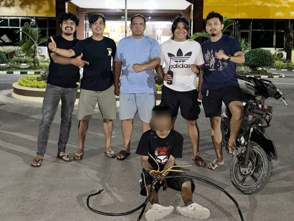“Dalam penangkapan tersebut, kami turut mengamankan sejumlah barang bukti, di antaranya satu kabel tower sepanjang empat meter serta satu motor Yamaha Xeon warna hitam tanpa nomor polisi (nopol),” ucap Yasin.